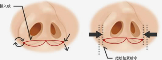 这是一种使用细线,在极短的时间(约10分钟)内就可以把鼻翼收紧缩小的手术。此外,由于不需要动用手术刀,术后效果自然,且几乎不会出现浮肿。