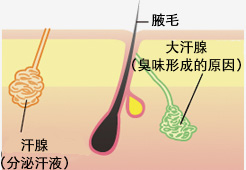 - 腋臭是指腋下散发出一种刺鼻臭味的现象。 腋下的大汗腺与外分泌腺是形成腋臭的主要原因。大汗腺分泌物从毛孔排出后,与空气接触,并和隐藏在毛孔中的细菌作用(葡萄球菌、革兰氏阴性杆菌),产生臭味物质。 而汗腺分泌的汗液导致臭味扩散。这就是腋臭形成的原因。 因此,腋臭形成的根源在于大汗腺。只要将大汗腺去除,臭味就会消失。虽然腋臭不是一种疾病,但是它的刺鼻味道会给他人带去不愉快,特别对于气味敏感的日本人,更加是雪上加霜。腋臭患者往往无法察觉出自己身上的臭味。他们通常由别人指出后才发觉自己的症状。 因此,有可能在不知不觉中,给周边的人造成了很多不愉快。建议尽快治疗为好。